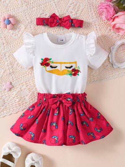 H HIBOBI 3pcs/Set Baby Girls Spring/Summer Short Sleeve Eid Mubarak Printed Bodysuit, Skirt And Headband Set - Hot Pink - View 1