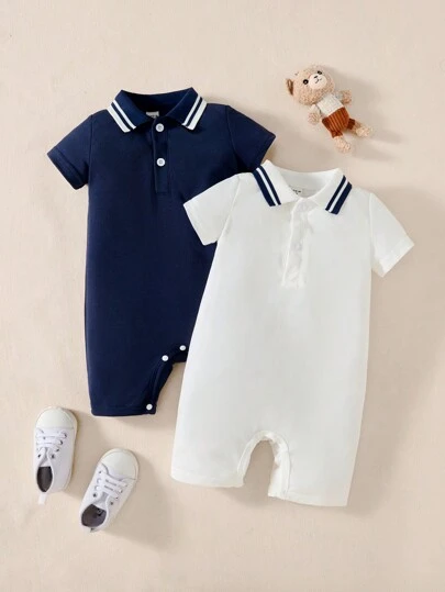 Souflis Souflis Baby Boy Casual Collared Button-Up Romper Shorts, 2 Colors Black & White, Suitable For Daily Outings And Outdoor Activities - Black and White - View 1