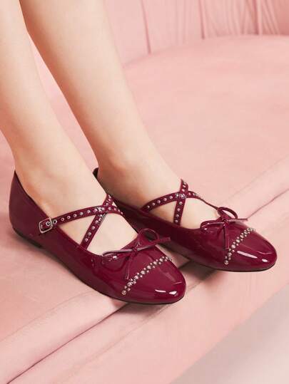 CUCCOO DOLLMOD Women's Comfortable Flat Shoes With Rhinestone Decoration, Elegant Cross Style Spring Shoes Spring Break Easter - Burgundy - View 1