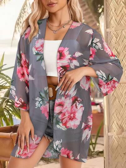 Women's Floral Print Kimono Loose Beachwear, For Summer Vacation - Grey - View 1
