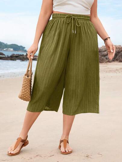 SHEIN VCAY Plus Size Solid Color Cropped Summer Pants - Army Green - View 1