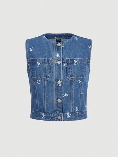 SHEIN MOD Women Denim Sleeveless Fitted Casual Vest, Blue - Medium Wash - View 1