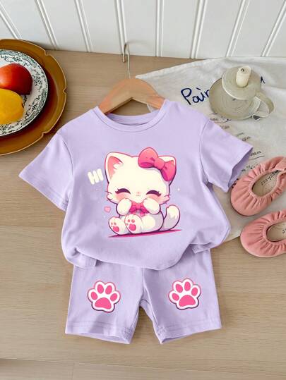 SHEIN Leap Crew Baby Girl Casual Minimalist Short Sleeve & Shorts Set, Suitable For Summer - Mauve Purple - View 1