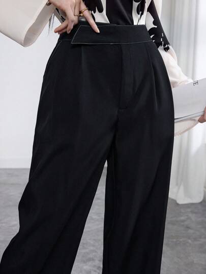 Modelyn Solid Color Asymmetrical Waist Design Color Blocking Wide Leg Women Dress Pants - Black - View 1