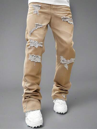 Denimly Boys' Fashion Casual Versatile Academic Denim Pants, Elastic Waist, Zipper Front, Ripped Distressed Washed Jeans - Khaki - View 1