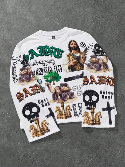 PAVTROS Manfinity Streetrush Men's Round Neck Short T-Shirt With Trumpet Sleeves, Positioning Print Pattern, Jesus Religious Fun Graffiti Print, Couple Wear, Unisex Style, Daily Leisure Commuting Wear In All Seasons, Funny Graffiti Print,Boyfriend Gifts,Rapper Top - Multicolor - View 5