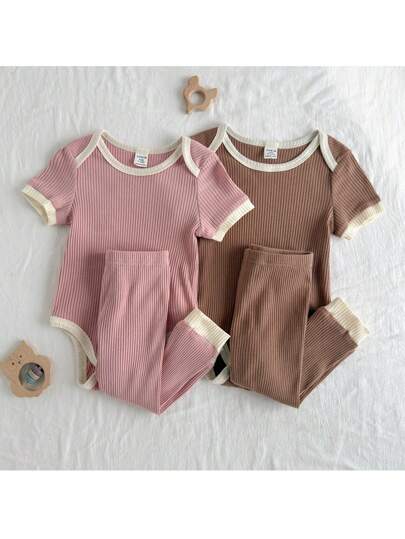 Loomiva 4PCS Baby Girl Color Block Soft Knit Long Sleeve Ruffle Shoulder Bodysuit & Elastic Waist Long Pants Set - Pink - View 1