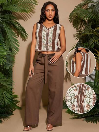 SHEIN SXY Vintage Patchwork Casual Handmade Crochet Short Vest With Embroidery Knit Top - Apricot - View 1
