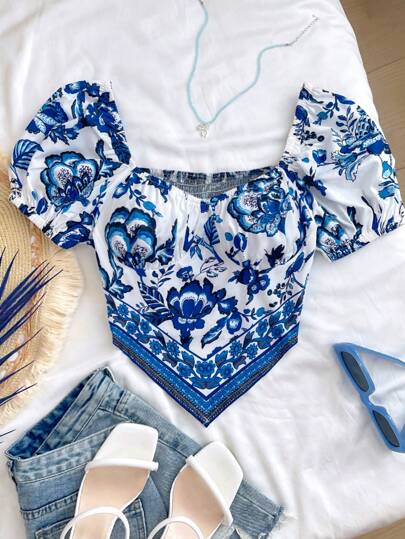 SHEIN Teen Girls Asymmetrical Hem Square Collar Vacation Shirt With Plant Print - Blue and White - View 1