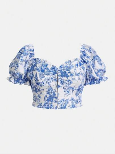 SHEIN ICON Plus Size Lantern Sleeve Retro Blue & White Floral Print Cropped Top, Vintage Palace Style - Blue and White - View 1