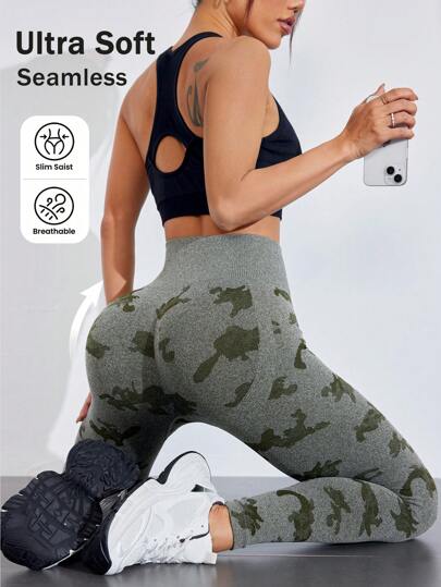 Easithlete Seamless High Waist Camouflage Print Leggings For Women - Army Green - View 1