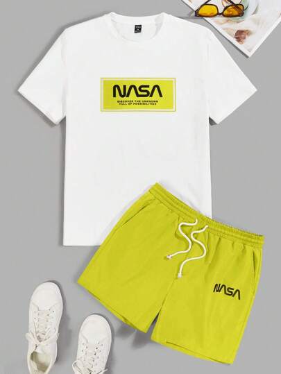 Manfinity VCAY Men's Casual Letter Print Short Sleeve T-Shirt And Shorts Set - Green - View 1