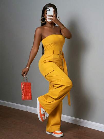 Slaydiva 2025 Summer New Arrival Music Festival, Easter, Western Style, Nomadic Style, St. Patrick's Day, Birthday Party, Graduation Season, Student Wear, Daily Outfit, Casual All-Match, Vacation, Cruise Travel, Beach, Sun-Bathing, Fashion, Street Style, Minimalist Casual, Utility Pockets, Strapless, Waist Tie, Metal Buckle, Yellow Women Jumpsuit - Yellow - View 1