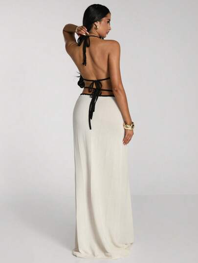 SHEIN BAE Women's Sexy Contrast Color Trim Backless Halter Long Knitted Dress Dresses For Women Summer Outfits For Women Vacation Outfits Woman White Dress Summer Dresses For Women Summer Dress Beach Outfits For Woman Western Wear Women Beach Vacation Bathing Suit Cover Up - Black and White - View 1