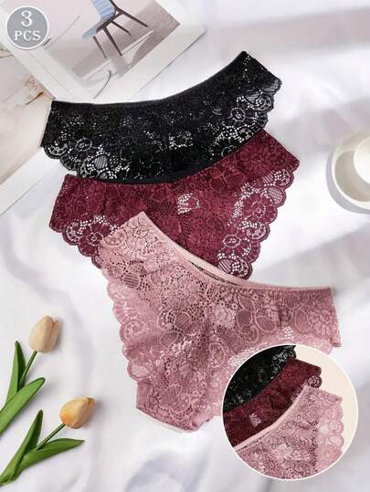 3pcs Solid Seamless Floral Lace Briefs Sexy Comfy Breathable Stretchy Intimates Panties Women's Lingerie Underwear - Multicolor - View 1