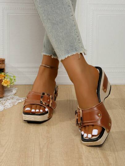 Platform Studded Sandals, Fashion Comfortable Versatile Summer High Heel Sandals For Women, Size 42 - Khaki - View 1