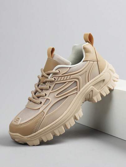 Men's Round Toe Lace-Up Men Sports Shoes For Men, Colorblock Letter Lightweight Breathable Chunky Men Sneakers ,Slip-Resistant Wear-Resistant Sports Outdoor Running Shoes Casual Men Shoes - Khaki - View 1