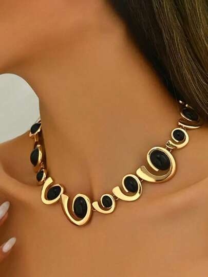 1pc Elegant Geometric Spiral Shell Design Women Necklace, Boho Style Zinc Alloy Black Oval Resin Inlaid Mix&Match Pendant Clavicle Chain, Suitable For Everyday And Party Wear - Golden - View 1