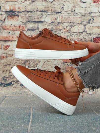 Brown Lace-Up Low-Top Flat Walking Shoes For Women, Comfortable Travel Casual Sneakers, School/Campus Style Suitable For Holidays, Parties, Gatherings, Commuting, Gift - Brown - View 1
