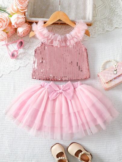 SHEIN Leap Crew Young Girl Mesh Yarn Splice Sequin Sleeveless Top And Bow Elastic Waist Net Yarn Hem Short Skirt 2pcs Set - Pink - View 1