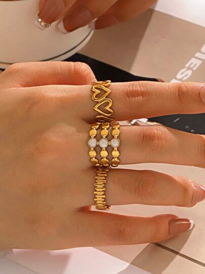 3pcs/Set Stainless Steel 18K Gold Plated Minimalist Geometric Heart Open Ring, Suitable For Women Everyday Wearing - Multicolor - View 1