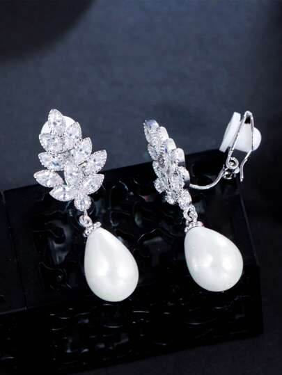 1 Pair Sparkling White CZ Leaf Dangling Pearl Non-Pierced Ear Clips Earrings For Women Without Ear Holes, Jewelry For Brides, Engagement, Wedding, Bridal, Banquet, Party, Prom, Pageant, Bridesmaids, High Quality Accessories - 1 Pair Clip On Earrings - View 1