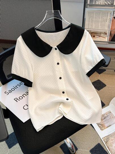 Franclia Contrast Color Block Peter Pan Collar Casual Commuter Minimalist Style Women's Shirt, Spring/Summer - White - View 1