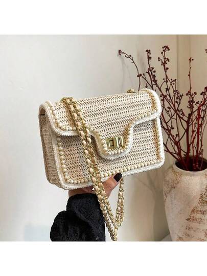 Women's Hand Woven Straw Woven Handbag, Lightweight Beach Summer Beach Vacation Shoulder Handbag, Pearl Edging, Fashionable And Simple Flip Top Crossbody Small Square Bag - Beige - View 1