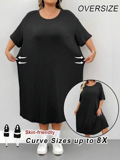 SHEIN CURVE+ Women's Plus Size Black Daily Basic Casual Simple Solid Color Side Slit Detail Round Neck Loose Short Sleeved Mid Length T-Shirt Dress - Black - View 1