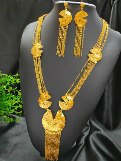 2PCS Women's Gold Plated Long Tassel Necklace And Earring Jewelry Set, /African/Dubai Bride Wedding Party Occasion, Valentine's/Mother's/Easter Day Gift, Necklace And Earrings Set - Yellow Gold - View 1