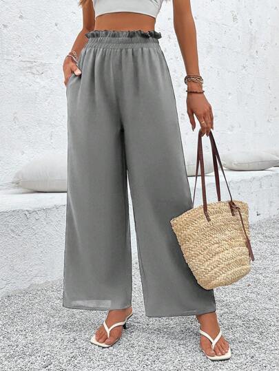 SHEIN LUNE Women's Solid Color Flared Wide Leg Casual Trousers With Waist Pocket - Grey - View 1