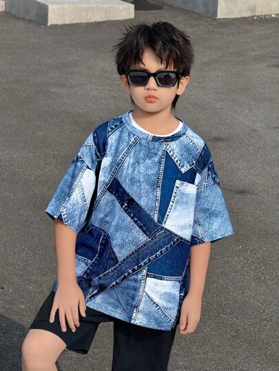 SHEIN Tween Boys' Casual Versatile Comfortable Denim Effect Loose Fit Crew Neck Short Sleeve Knit T-Shirt, Suitable For School, Garden, Beach, Birthday, Spring/Summer, Fall, Winter - Multicolor - View 1