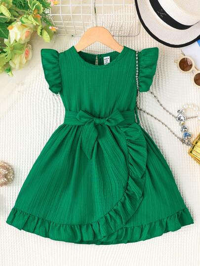 SHEIN Young Girl Comfortable Casual Ruffle Hem Dress With Waist Belt, Summer - Green - View 1