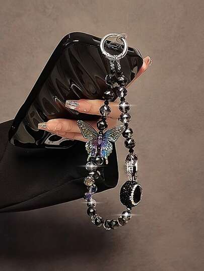 1pc Butterfly Crystal Bling Phone Lanyard, Delicate Crystal Beaded Short Wrist Strap With Clip Anti-Lost Phone Cord, Luxury Vibe - Multicolor - View 1