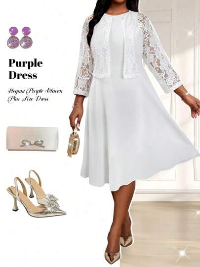Fleurora Spring And Summer Autumn And Winter Elegant Commuting Office Purple Woven Woven Flared Flowy Button Midi Three Quarter Length Sleeve Plus Size Co-Ords - White - View 1