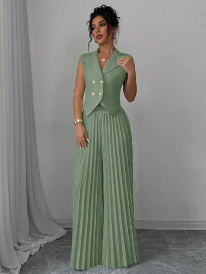 Selianne Women's Elegant Solid Color Double-Breasted Vest And Wide-Leg Pleated Pants Suit - Mint Green - View 1