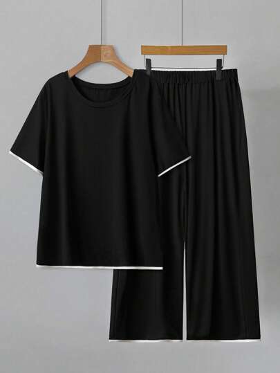 SHEIN CURVE+ 2pcs/Set Plus Size Women Round Neck Short Sleeve Top And Pants - Black - View 1