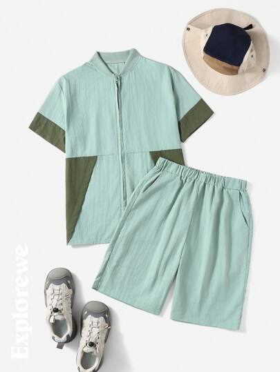 2pcs/Set Teenage Boys Casual Fashionable Minimalist Outdoor Splicing Short Sleeve Shirt & Shorts Set, Suitable For Spring/Summer Everyday Wear, Hiking, Summer Camp - Multicolor - View 1