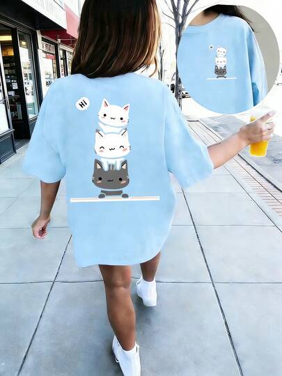 Tween Girls Casual Cat Print Crew Neck Short Sleeve T-Shirt, Summer Top - Baby Blue - View 1