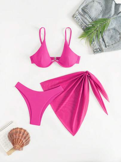 Swim Vcay 3pcs/Set Solid Color Bikini Set With Underwire Top, Suits For Beach Vacation For Summer - Coral Pink - View 1