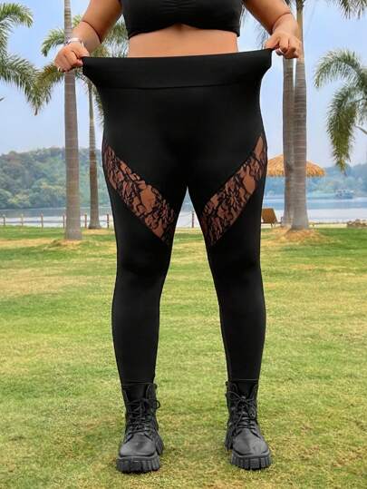SHEIN EZwear Black Plus Size Lace Trim Leggings - Black - View 1