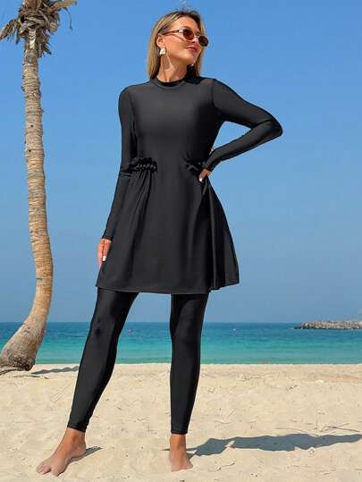 Swim Mulvari New Women's Beach Summer Two Pieces Swimwear. Black. Crew Neck Long Sleeve, Ruffle Waist Design, Modest Cover-Up Pants, Conservative Resort Burkini Set - Black - View 1