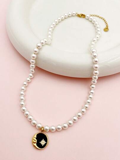 1pc Elegant Dainty Shell Beads Chain 18K Gold Plated Stainless Steel Black Dripping Oil Star & Moon Charm Necklace For Women Daily & Beach - Gold+White - View 1