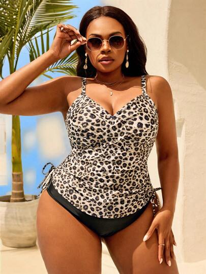 Swim Lushoire Women Plus Size Leopard Print 2 Pieces Set - Halter Neck Criss-Cross Front Drawstring Waist Top And Triangle Bottoms Vacation Bikini For Summer - Multicolor - View 1