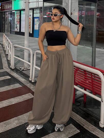 Flirla Plus Size Women Wide Leg Casual Loose Drawstring Pants For New Year Clothes - Coffee Brown - View 1