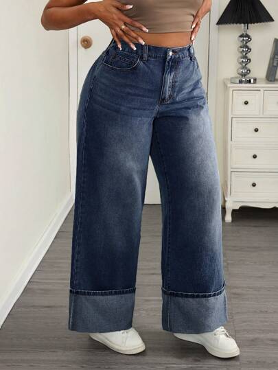 SHEIN SXY Plus Size Medium Wash Denim Extra Long Wide Leg Jeans With Zipper Detail - Medium Wash - View 1