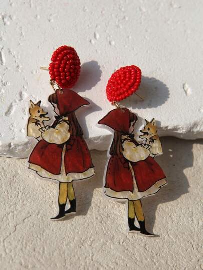 Pink Snail Cute Handmade Seed Bead Stud Earrings, Funny Statement Cartoon Girl Holding Dog Themed Acrylic Resin Drop Earrings, Fashion Jewelry Earrings For Women Girls, Holiday/Party/Gift - Red Riding Hood Girl Holding Puppy - View 9