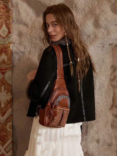 1pc Embossed Retro Design PU Women Chest Bag, Can Be Used As Shoulder Bag Or Backpack - Chocolate Brown - View 1