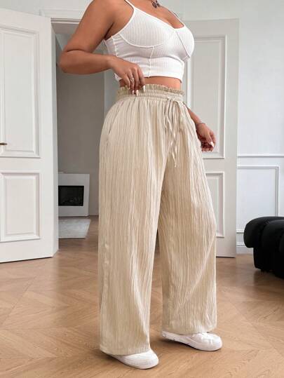 Solflare Plus Size Apricot Drawstring Waist Loose Straight Leg Casual Pants - Apricot - View 2