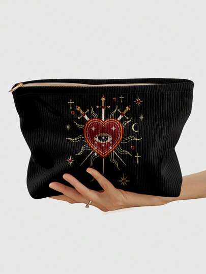 ROMWE Goth Heart, Eye, Teardrop And Sword Pattern Corduroy Zipper Makeup Bag, Lightweight Multi-Functional Makeup Organizer Pouch With Lining - Multicolor - View 1